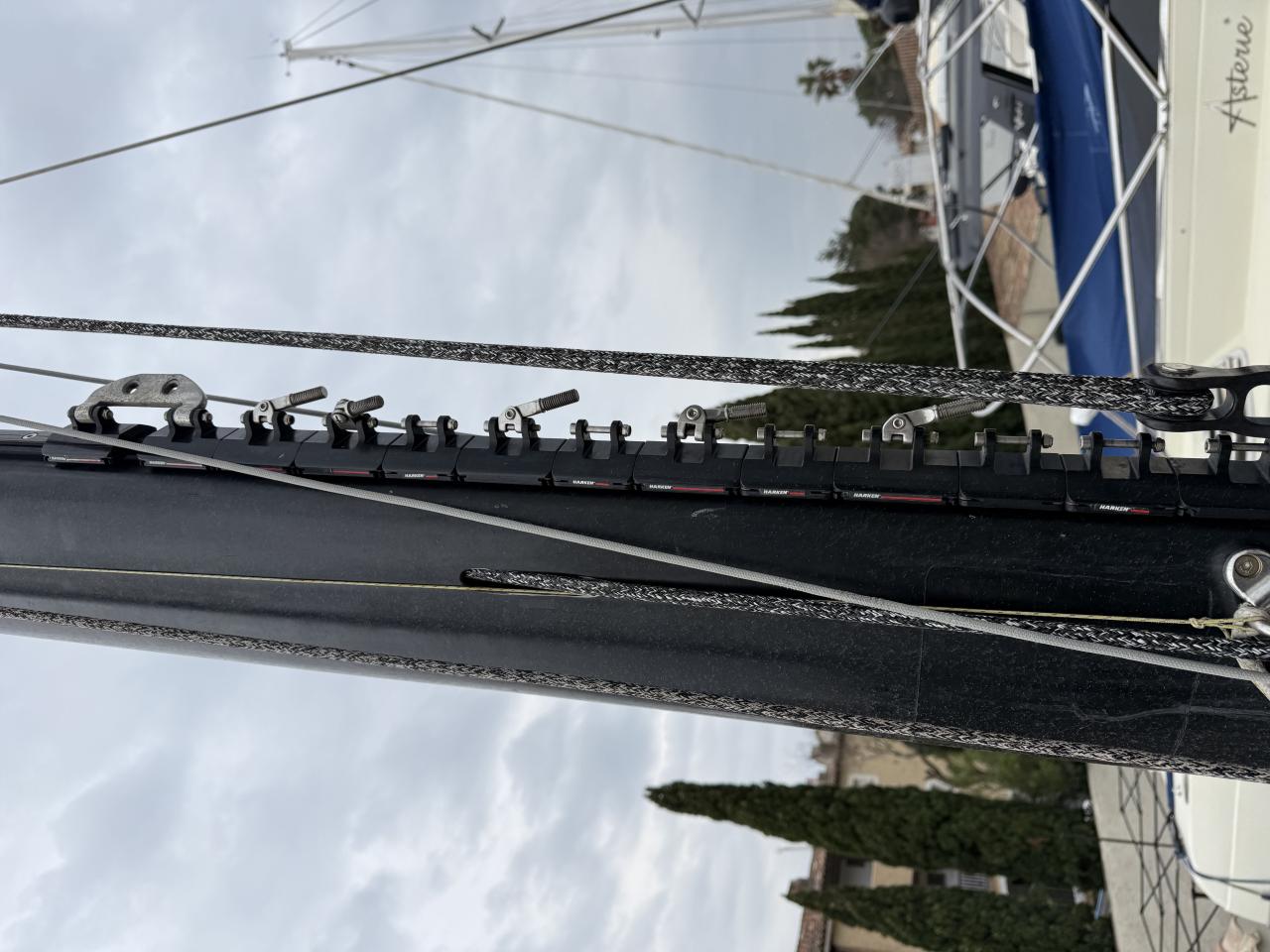- Mat carbone AXON posé sur le pont avec deux étages de barres de flèche. Bôme AXON carbone